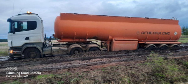 По фотографиям видно, что грунтовую дорогу размыло от влаги, грунт не выдерживает веса автомобилей, и они вязнут в грязи.