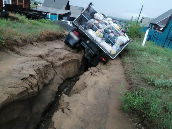 - На улице Нагорная в Кяхте так сильно размыло дорогу (собственно, как каждый год и происходит), что туда угодил грузовик с мусором, - сообщила автор снимка.