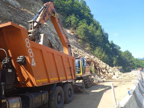 Работы по устранению последствий обвала продолжаются. На сегодняшний день силами подрядных организаций вывезено более 12 тысяч кубометров скального грунта. В работах задействовано шесть самосвалов, экскаватор, погрузчик, одна дорожная бригада. Подрядная организация дежурит здесь круглосуточно.