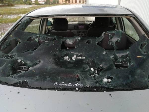 Местные жители поделились фотографиями повреждённых машин. Так, у одной из них полностью разбито заднее стекло. Многие укрывали свои припаркованные машины покрывалами, чтобы уберечь.