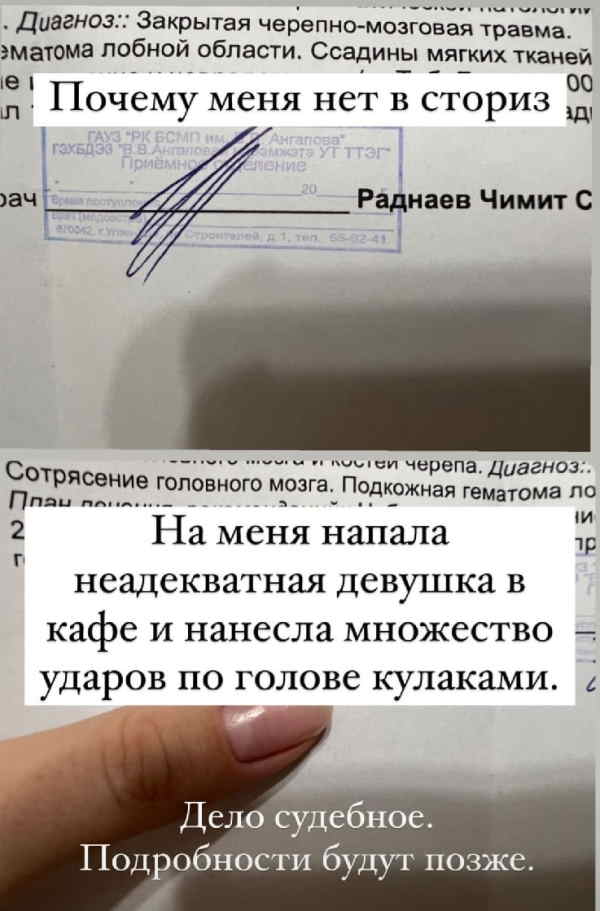 - В этот момент мне по голове прилетел лютый удар по голове, то ли тарелка, то сразу кулак. У меня сразу звёздочки в глазах. Она цепляет за мои волосы и со всей дури бьёт меня по голове. Я пыталась отцепить её от меня, оттащить, но не смогла этого сделать, - написала пострадавшая.