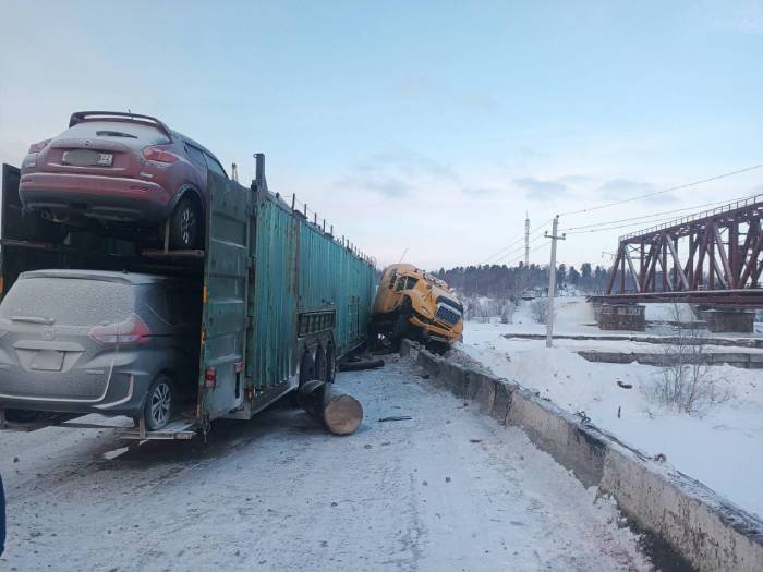 Сегодня, 17 февраля, в Кабанском районе Бурятии в ДТП попал автовоз. Судя по фото с места аварии, он врезался в ограждение и перекрыл часть дороги.