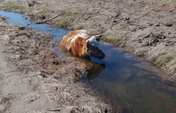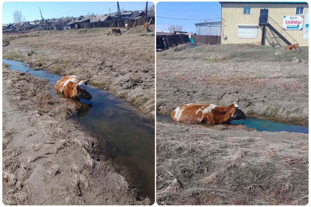 Бродящие по Мухоршибири коровы попадают в разные неприятности. Недавно одно жвачное увязло в грязи в пойме реки Мухоршибирка. Случилось всё накануне недалеко от Моста на улице Доржиева.