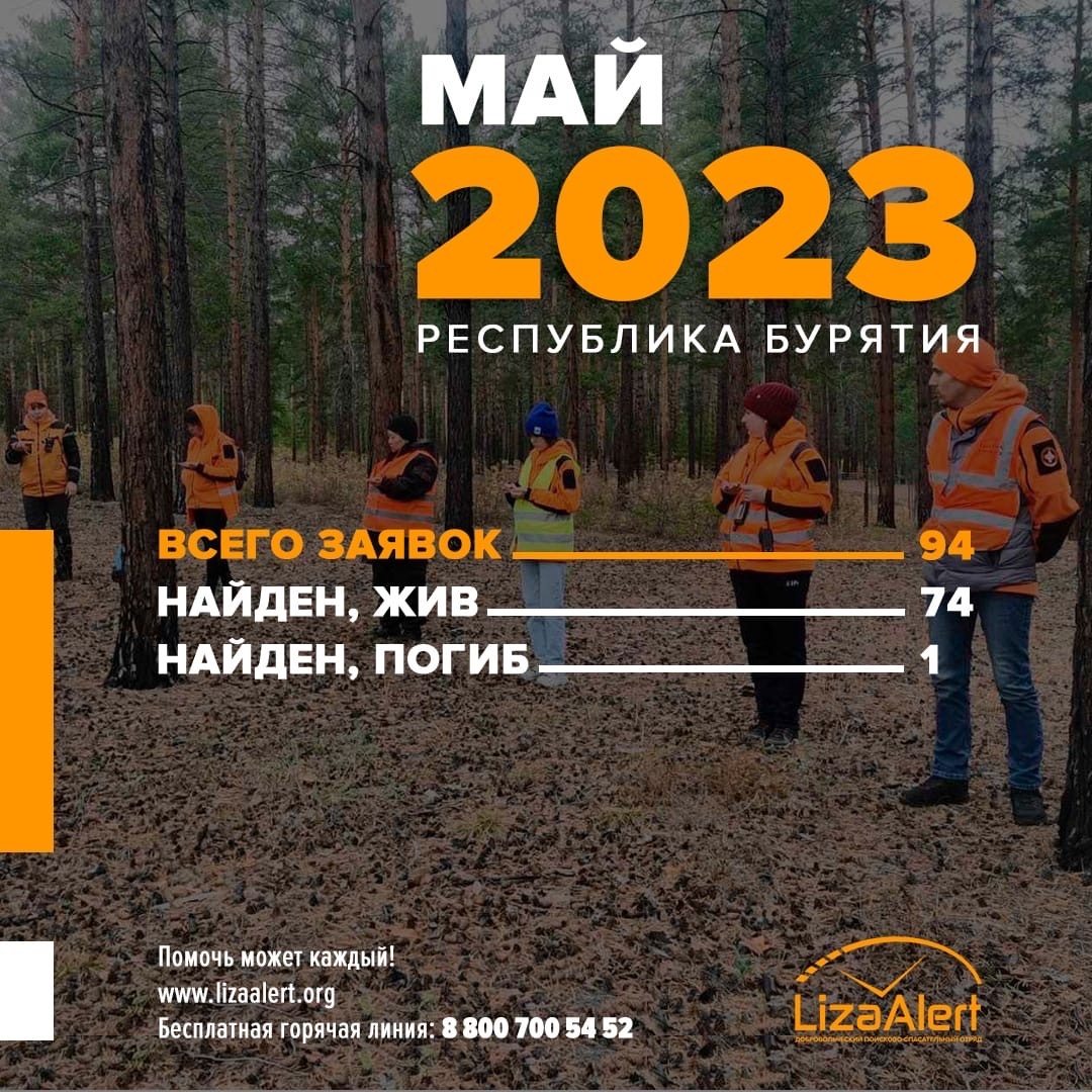 Представители добровольческого поисково-спасательного отряда «ЛизаАлерт» в Бурятии отчитались о своей работе в мае 2023 года. Всего за последний месяц весны они получили 94 заявки на поиск пропавших людей по всей республике.