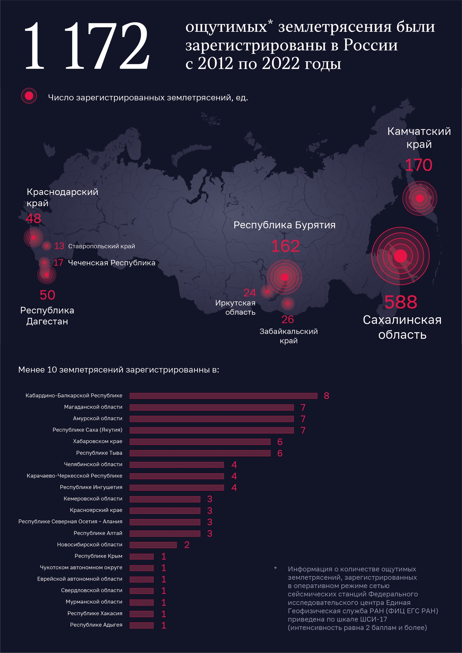 На днях в Счётной палате РФ со ссылкой на данные МЧС России сообщили, что за последние 10 лет – с 2012 по 2022 годы – в стране произошло 1172 ощутимых землетрясения и восемь чрезвычайных ситуаций. Наиболее активными были сейсмические зоны Кавказа (Дагестан и Чечня), Дальнего Востока (Камчатка и Сахалин) и Байкальского региона (Бурятия и Забайкальский край).