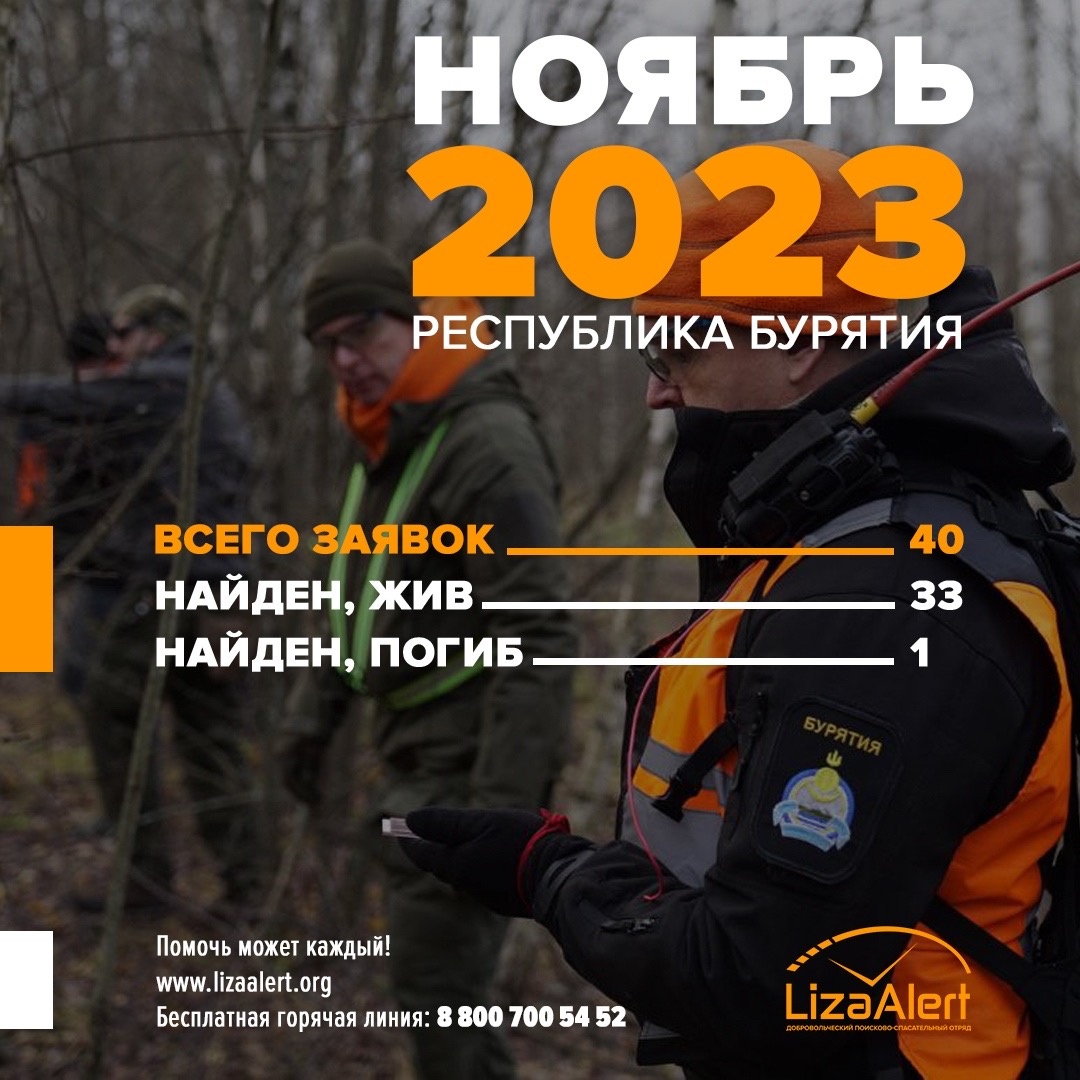 Представители добровольческого поисково-спасательного отряда «ЛизаАлерт» в Бурятии отчитались о своей работе в ноябре. Всего за последний осенний месяц они получили 40 заявок на поиск пропавших людей по всей республике. В октябре было в два с лишним раза больше – 94.