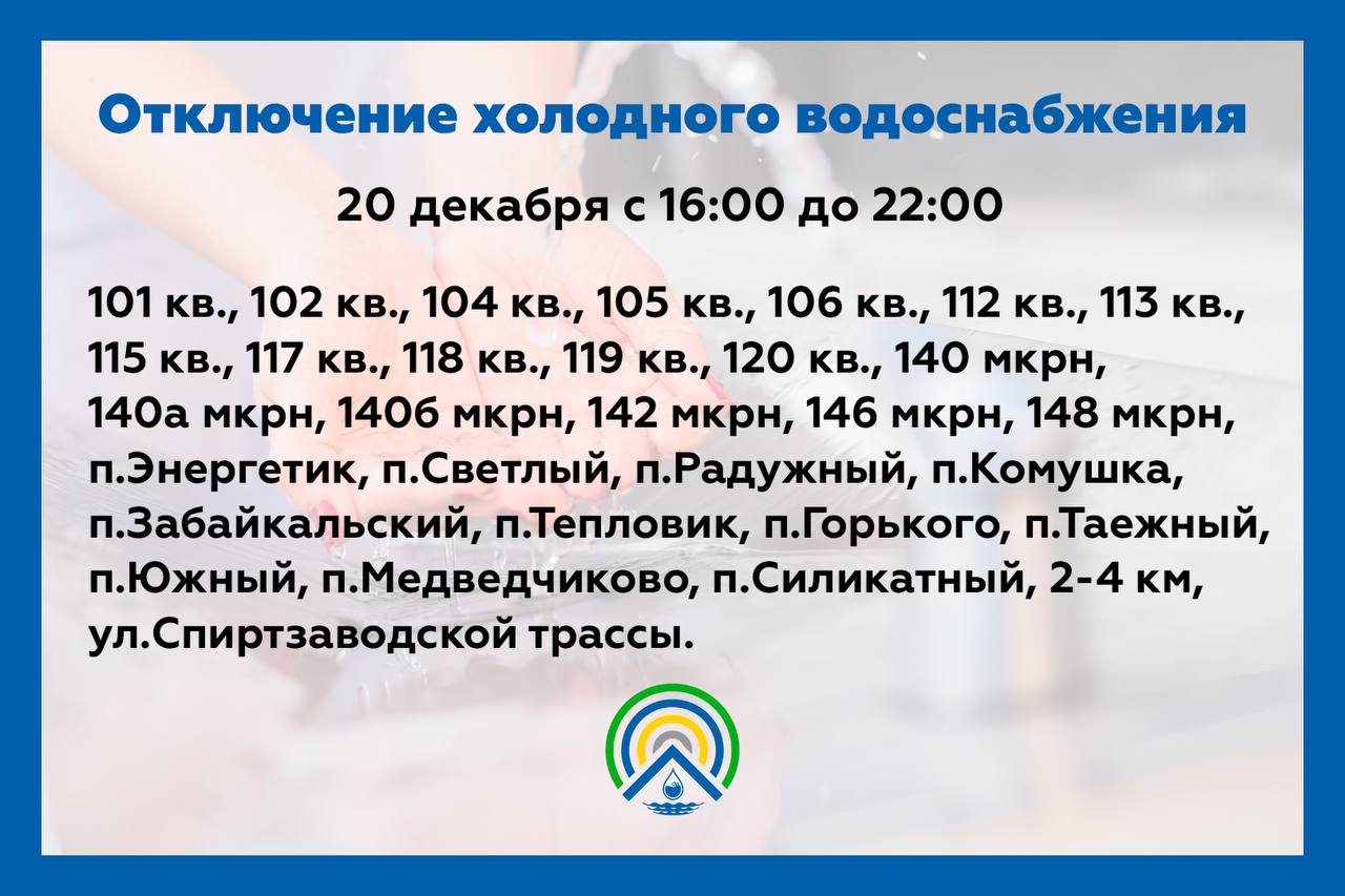Как сообщал «Байкал-Dailу», около пяти часов утра 20 декабря произошла крупная авария на сетях водоснабжения на острове Спасский. Там обрушилась одна из двух ниток трубопровода. В итоге произошло отключение на насосной станции «Юго-Западная», которая обеспечивает холодной водой весь Октябрьский район (и 40-е кварталы, и 100-е).
