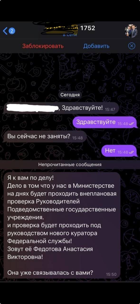 По словам министра, схема довольно простая: злоумышленники пишут пользователям от его имени, предупреждая, что скоро с ними свяжется некий новый куратор. А последний требует куда-то перевести деньги или выдать определённую информацию.