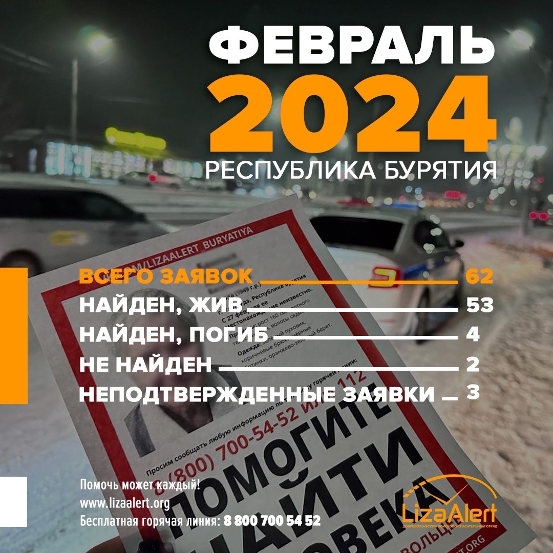 Представители добровольческого поисково-спасательного отряда «ЛизаАлерт» в Бурятии отчитались о своей работе в феврале. Всего за последний зимний месяц они получили 62 заявки на поиск пропавших людей по всей республике. В ноябре было на 10 меньше – 52.