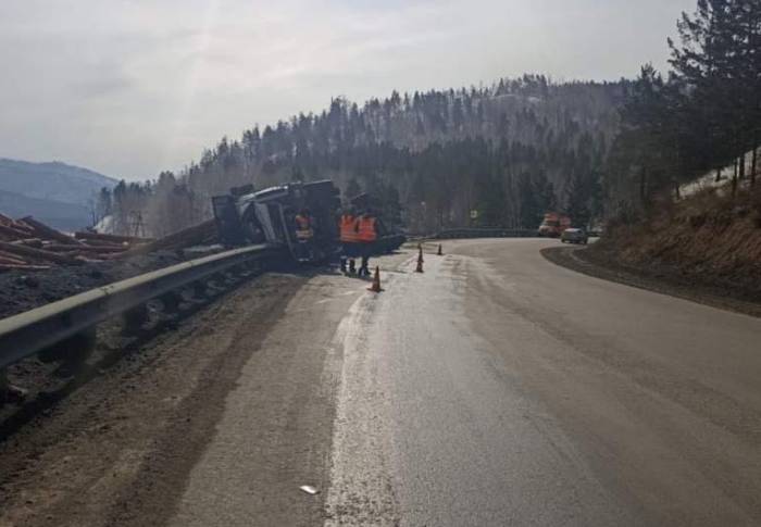 На перевале Мандрик в Прибайкальском районе Бурятии перевернулся лесовоз, гружённый древесиной.