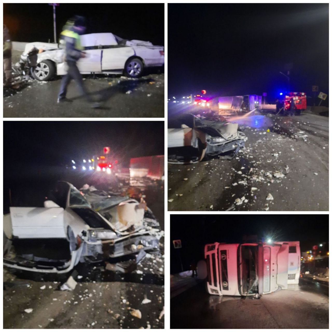 Машины, судя по фото с места аварии, получили серьёзные механические повреждения. Легковушку при столкновении смяло, а большегруз перевернулся на бок.