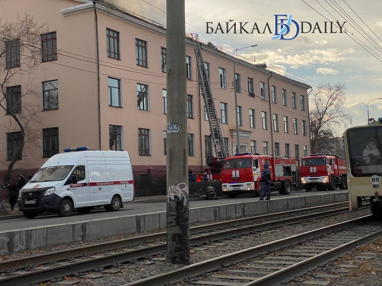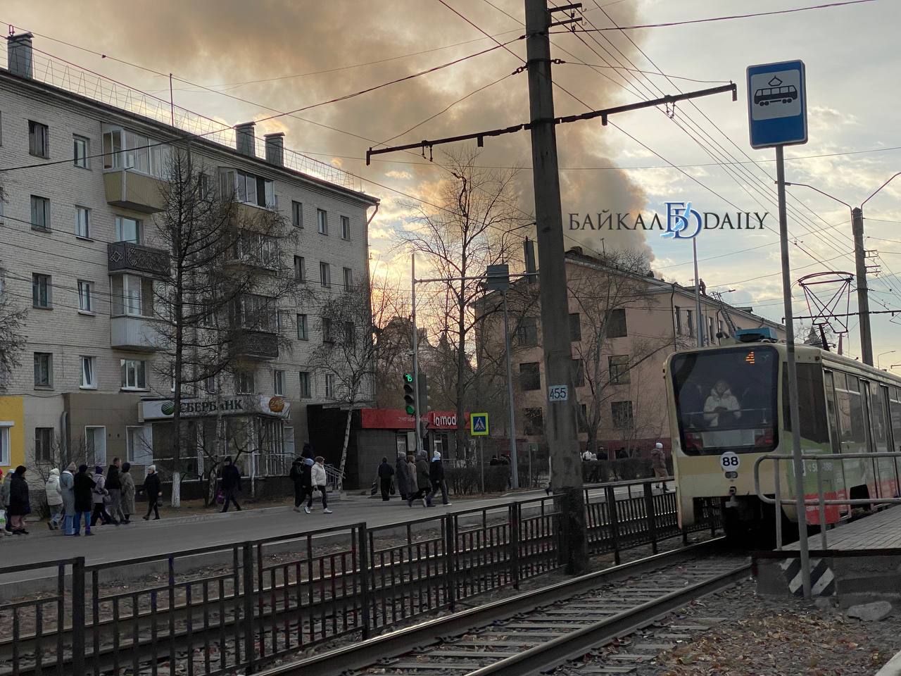 В Улан-Удэ тушат крупный пожар в здании на улице Терешковой, недалеко от Русского драматического театра. Густые клубы дыма видно далеко вокруг.