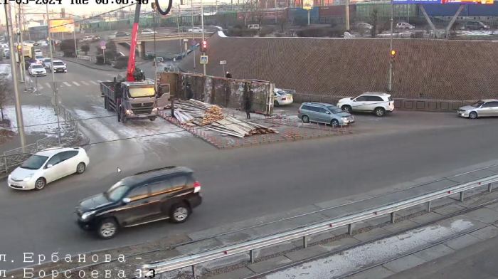 Вечером 4 ноября в центре Улан-Удэ произошло необычное ДТП. На перекрёстке улиц Ербанова-Борсоева перевернулся прицеп тягача. По проезжей части разлетелись доски, которые вёз водитель.