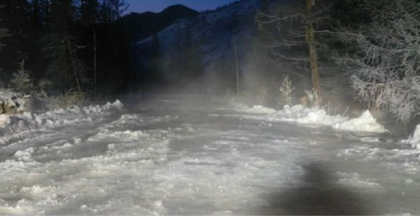 В местности Обтой в Окинском районе образовалась опасная наледь. Она вышла на дорогу