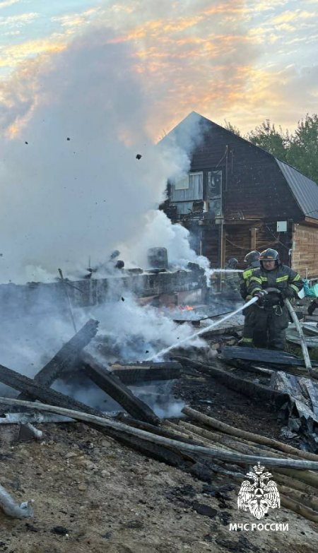 По словам собственницы, она услышала «хлопок». Спустилась со второго этажа, увидела, что веранда охвачена огнём. Находившиеся в доме пять человек эвакуировались через окно.