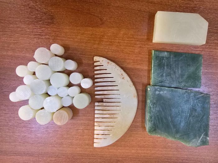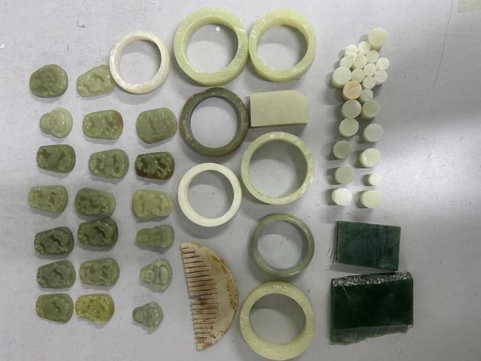 Всего в багаже нарушителя было обнаружено 86 товаров: браслеты и гребень из нефрита, 27 необработанных камней нефрита разных цветов и размеров, значки отличия эпохи СССР, орденская книжка, денежные средства царских времен и эпохи СССР и др.