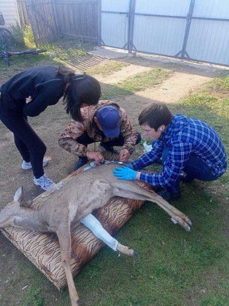 Общественный инспектор Бурприроднадзора Борис Кривошеев и местные ветеринары зашили раны и наложили гипс. Сейчас Туман – а именно так назвали животное – чувствует себя хорошо. Он ест, принимает антибиотики и уже начал вовсю бегать.