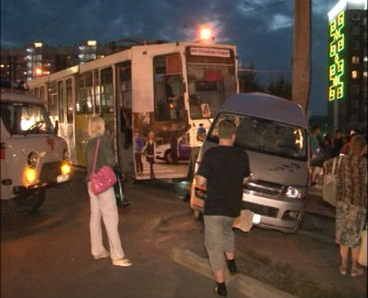 Вчера в Улан-Удэ произошло ДТП на трамвайных путях. Трамвай едва не раздавил маршрутку. В вечерний час маршрутное такси было заполнено полностью: в нём ехало 14 человек