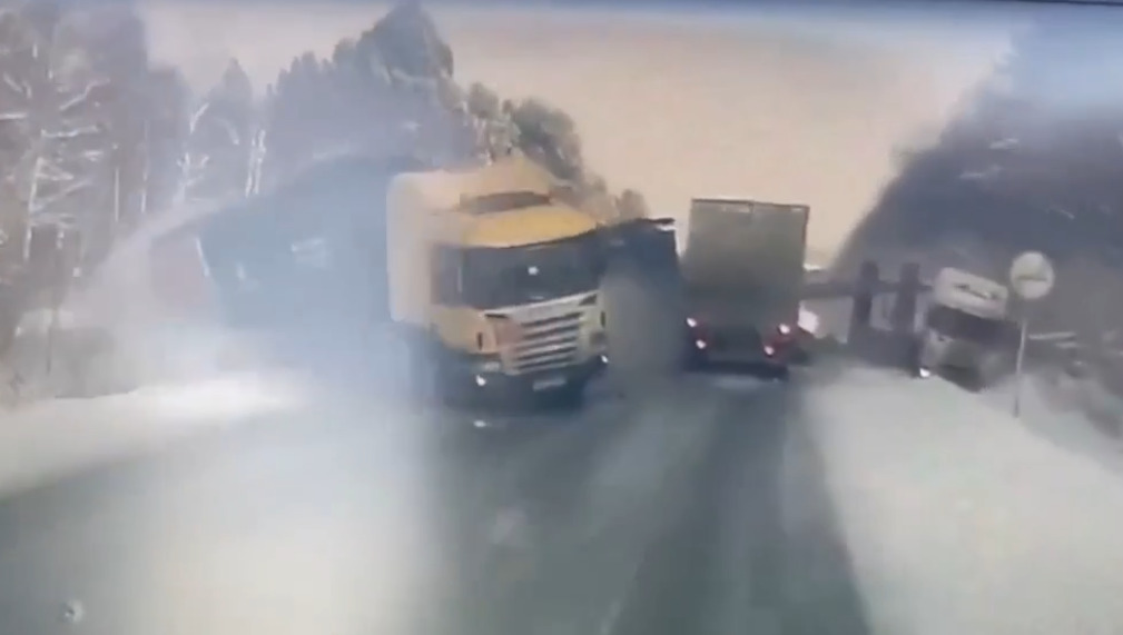 Камера видеорегистратора сняла момент ДТП с участием большегрузов в Кабанском районе Бурятии. Оно