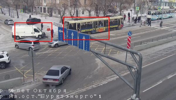 4 февраля на перекрёстке проспекта 50-летия Октября и улицы Чертенкова в Улан-Удэ произошло столкновение автобуса с трамваем. ДТП зафиксировала городская камера, видео опубликовали в телеграм-канале Комитета по транспорту.
