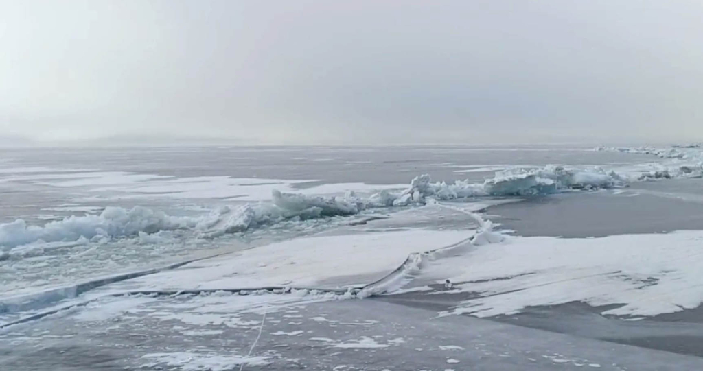 Трещина протянулась вдоль берега за горизонт в обе стороны, а её ширина в районе мыса составила порядка 1,5 метров. Разлом двигается и «дышит», местами образуя торосы.