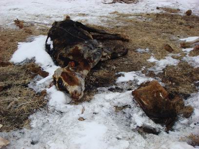 В окрестностях животноводческой фермы спустя пять дней практически ничего не изменилось. По-прежнему, собаки и птицы продолжают растаскивать останки животных по всей округе.