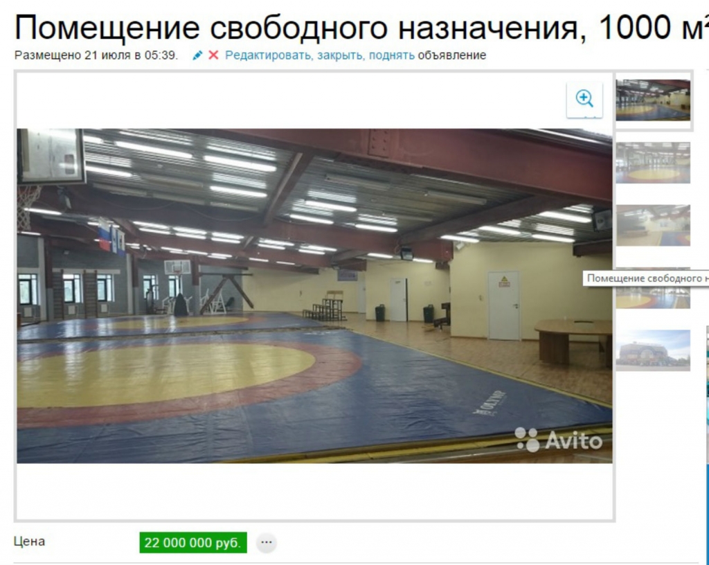 Спортивный зал площадью в тысячу кв. метров оценен в 22 млн рублей.