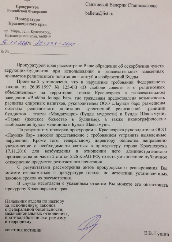 «Размещённые «ВКонтакте» фотографии с изображением статуи Будды в развлекательном заведении носят негативный характер в отношении религиозных убеждений лиц, исповедующих буддизм, является для их религиозных чувств оскорбительной», - пришла к выводу прокуратура, потребовав устранить нарушения.