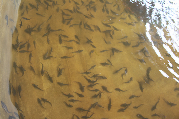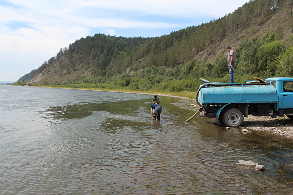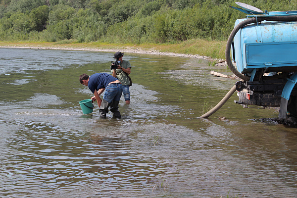 Селенга в этом году имеет очень низкий уровень воды, поэтому место для выпуска мальков выбрали подальше от рыбоводного завода. Это место не только удобное для выпуска рыбок, но и для того, чтобы молодь быстро адаптировалась к условиям реки.