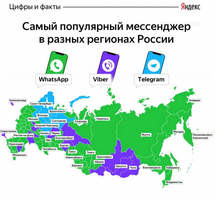Однако в целом жители России предпочитают WhatsApp, приоритет ему, в частности отдаёт весь Дальний Восток и Сибирь, Южный Урал, юг страны, Москва и центральная часть страны.