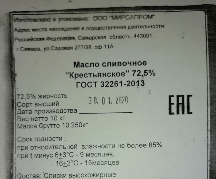 В Бурятии в марте специалисты управления Россельхознадзора отобрали пробу сливочного масла «Крестьянское» с массовой долей жира 72,5%, произведённого в Самаре ООО «Мирсапром».