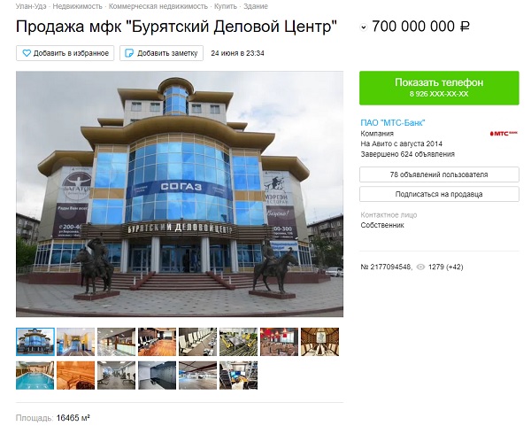 На сайте объявлений «Авито» 24 июня на продажу выставили многофункциональный административно-гостиничный «Бурятский деловой центр», который располагается на улице Борсоева в Улан-Удэ. Объект продаётся за 700 миллионов рублей.