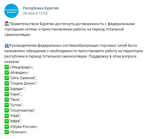 Как сообщал «Байкал-Daily», с 27 июня по 11 июля в Бурятии введён локдаун с закрытием большинства предприятий – от общепита и магазинов одежды до парикмахерских и СТО. Местные предприятия обязаны прекратить работу. Что касается федеральных торговых сетей, то большинство добровольно поддержали введённый локдаун.
