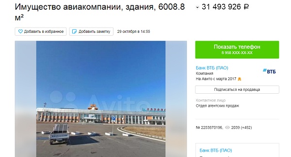 На сайте объявлений «Авито» недавно появилось любопытное объявление о продаже имущества авиакомпании и зданий за 31,4 млн рублей. В качестве иллюстрации использован снимок улан-удэнского аэропорта.