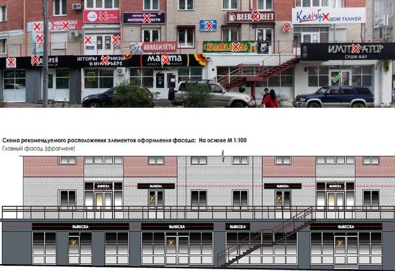 К примеру, в концепции говорится, что «цвет вывесок следует сочетать с цветовой гаммой здания, на котором она устанавливается. Главный принцип при выборе цвета - вывеска не должна нарушать цветовой цельности фасада. Рекомендуется подбирать нейтральные оттенки, допускается акцентировать детали яркими оттенками».