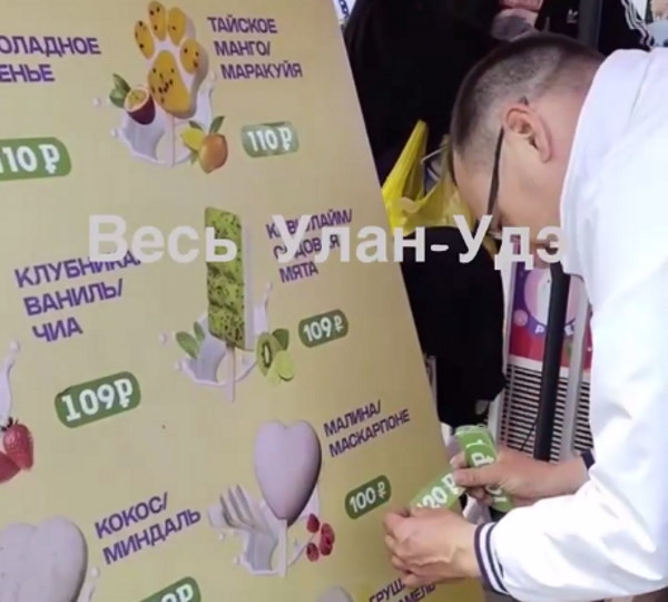 Так, на площади Революции продавец переклеил ценник на малиновое мороженое прямо на глазах у потенциальных покупателей. Занимательное видео опубликовали в телеграм-канале «Весь Улан-Удэ & Бурятия».