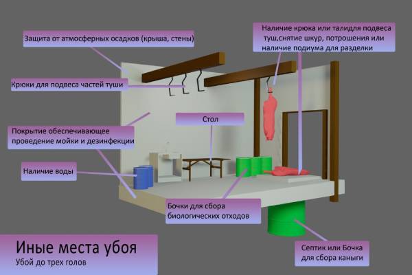 Обязательно и наличие воды в таком помещении, а ещё – площадки для разделки туши, ёмкостей для сбора биологических отходов и моющих и дезинфицирующих средств.