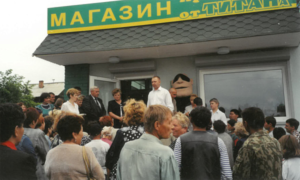На улице Дзержинского, 1, открылся и первый розничный магазин под вывеской «Титан». Без всякого преувеличения - по просьбам трудящихся. Люди приходили на оптовую базу и просили продать нужные им товары штучно. Не коробку, к примеру, сгущенки, а несколько банок, так как цены в «Титане» были привлекательные, продукты качественные и ассортимент уже гораздо шире, чем в первый год деятельности.